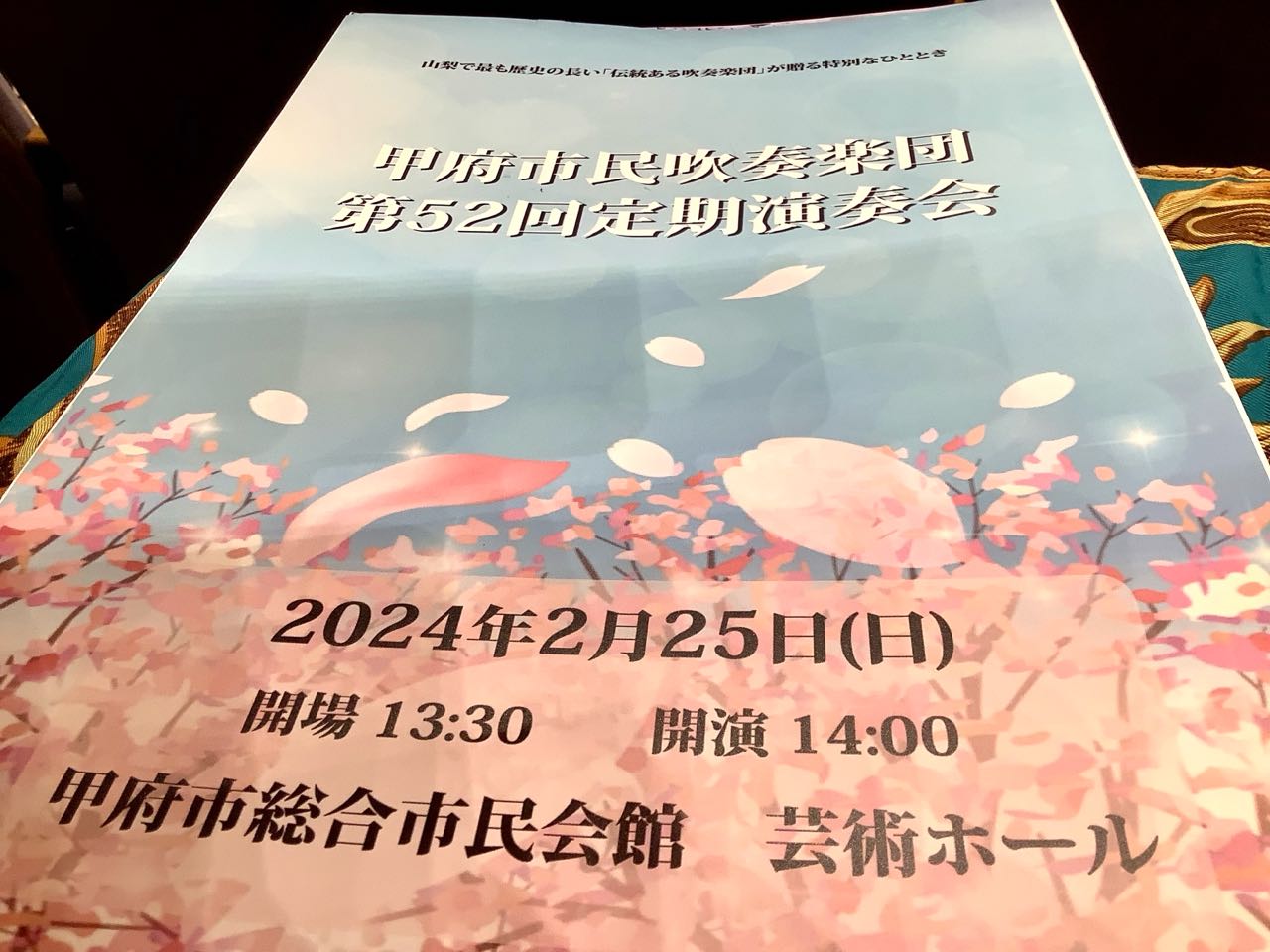 25日.雪の降る中を→14時から、甲府市民総合会館に於いて、甲府市民吹奏楽団→第52回、定期演奏会を聴きに.行ってきました、会場で、やまなし女性異業種の会の、和出さんと、お会いして、ご一緒に演奏を.お聴きしました、最初から、甲府市民吹奏楽団に参加して→今回52回目を迎えると言う。蓮沼さん(80才)と、→トランペット奏者→島田欣也さんの、素晴らしい演奏に、聴き惚れて.しまい.ました、今回は、甲府市立→東中学校の吹奏楽部を迎えて~→フレッシュなメロディーを取り入れて、楽しい.素晴らしい演奏会でした。体の中の全てが→.浄化された様な、気分でした。ご覧になって下さい、