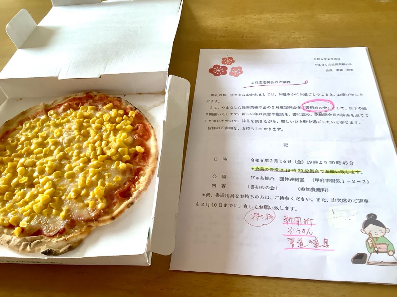 書き初めの会.終了後には→副会長の.花輪文香さん→「茶道教授」が、抹茶をたてて下さいます、抹茶と、美味しい和菓子を.いただきながら→楽しいひと時を過ごしたいと思っております、書き初めの会に→ご出席したい方は.当番の和出さんか.東條迄→お申し出てください.サイゼリアに、お土産の.「ソーセージピザ」を、頼んでおいたのに、家に帰ってきて、ピザを開いたら、びっくり.です→コーンピザに、変わっていました、きっと、間違えたんですよね。、ご覧になってください。.