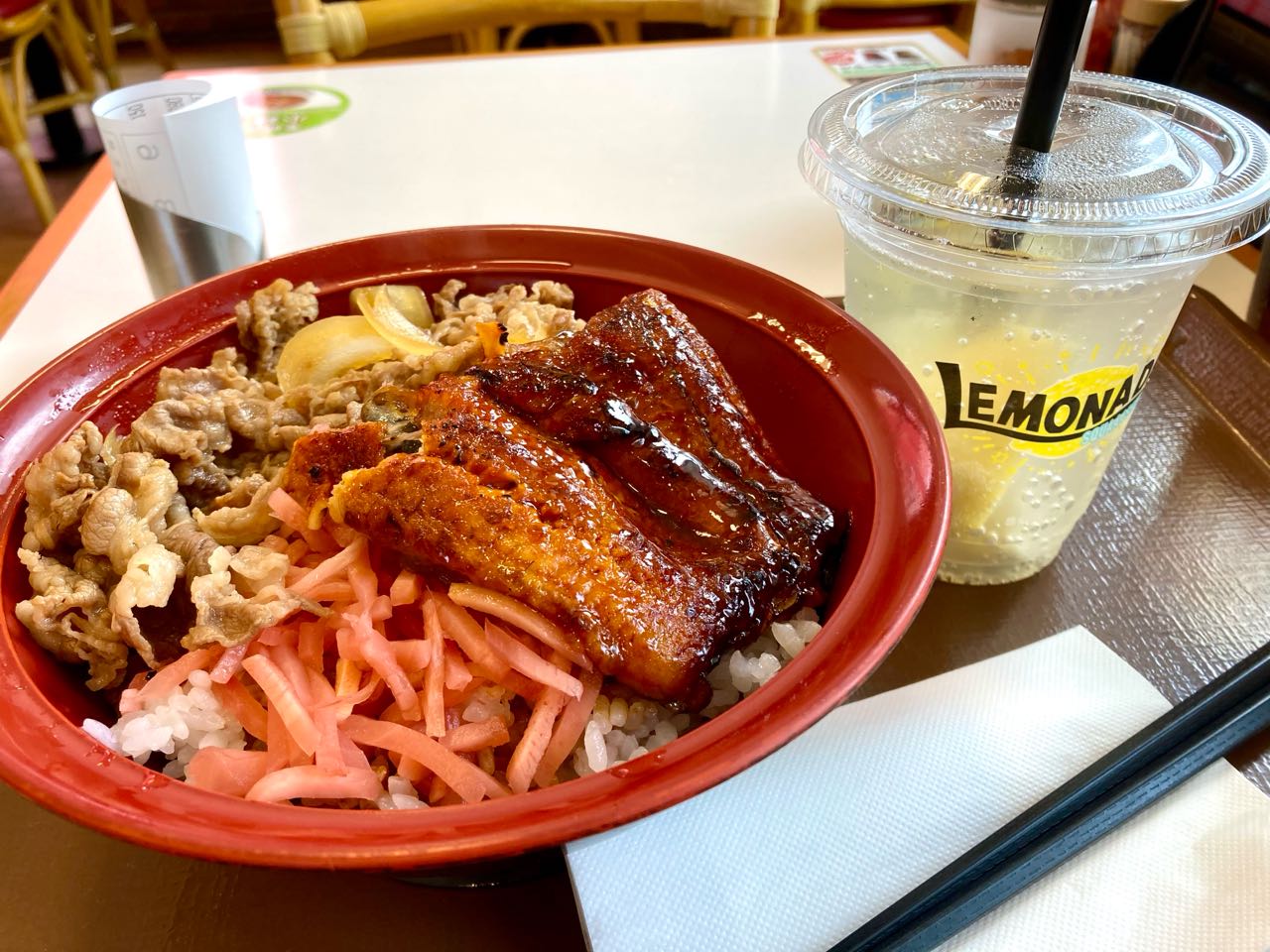 26日.午前→こま共立病院の受診を.終えてから、→13時から、甲斐市にあるスポーツジムに出向くため、先にお食事をしています、うなぎ→牛合いがけと、新製品の♪レモネーデを、サッパリと飲んでいます、