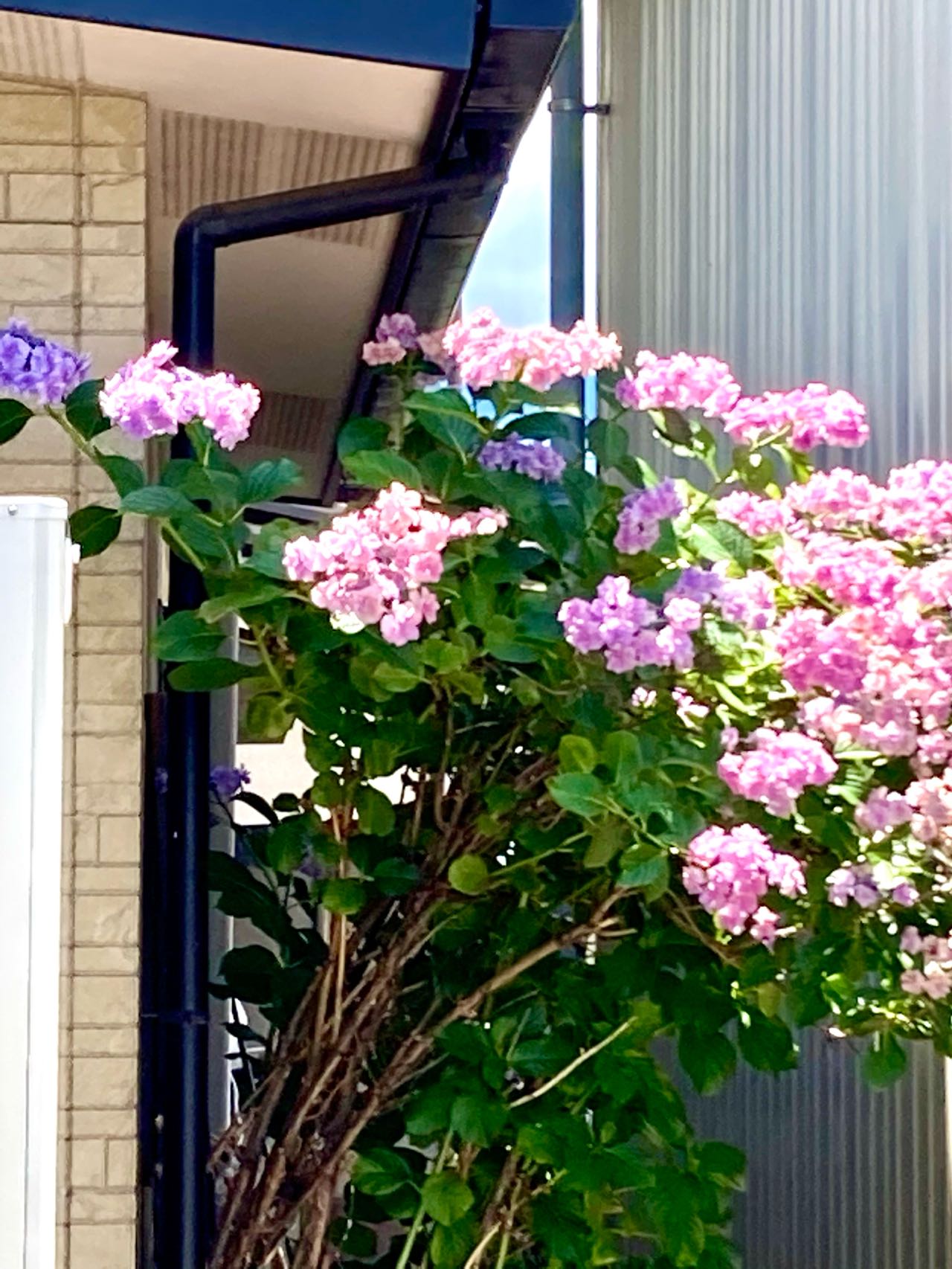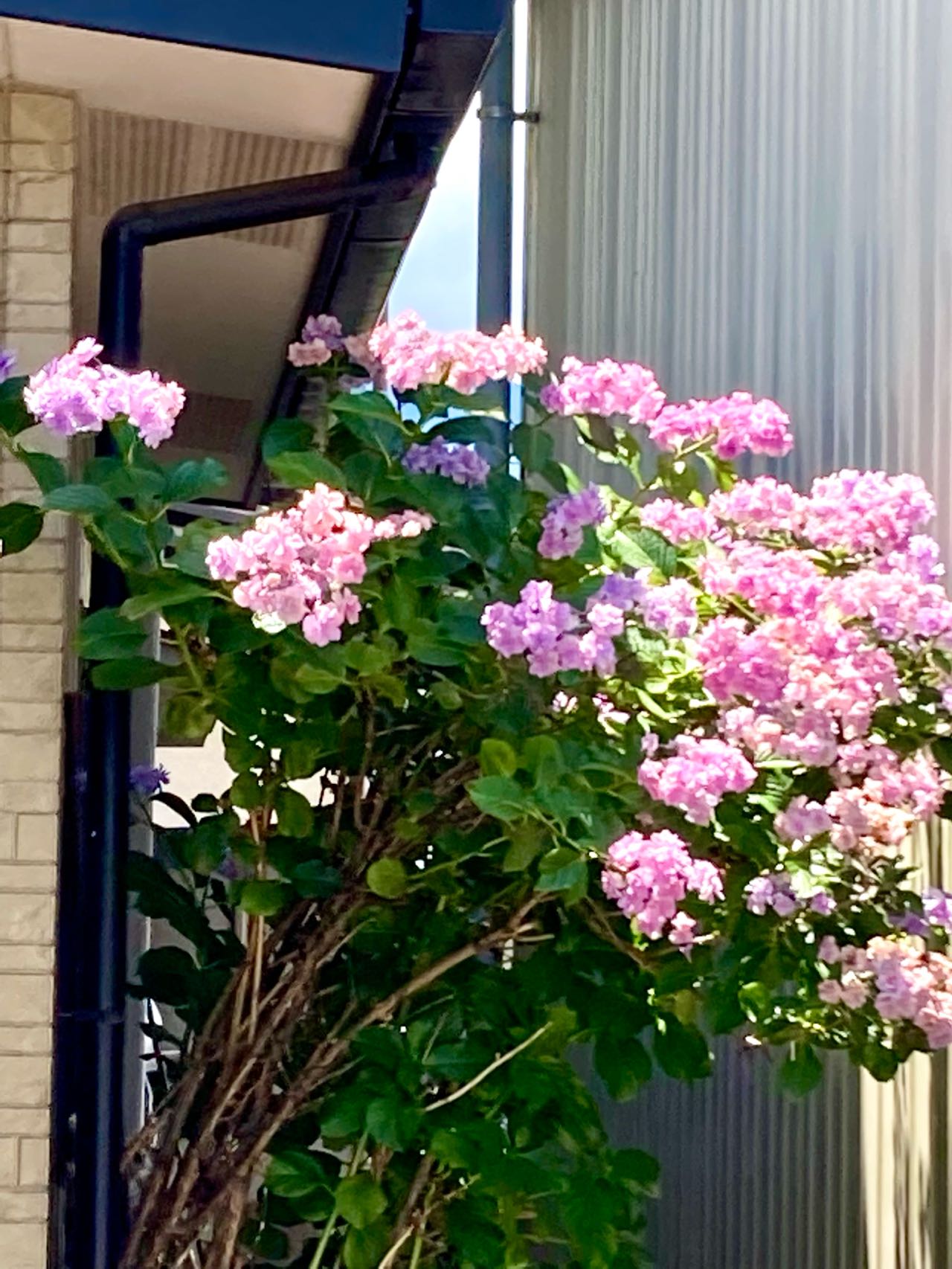 29日..土曜日.今朝まで降り続いた~大雨が.上がり→緑のカーテンも→琉球朝顔の花が、ベランダまで上り詰めた、元気な朝顔と→→♪お家の裏側で.♪お風呂場と倉庫の間で☆咲いている「紫陽花も」とても綺麗に咲いています。ご覧になってください。