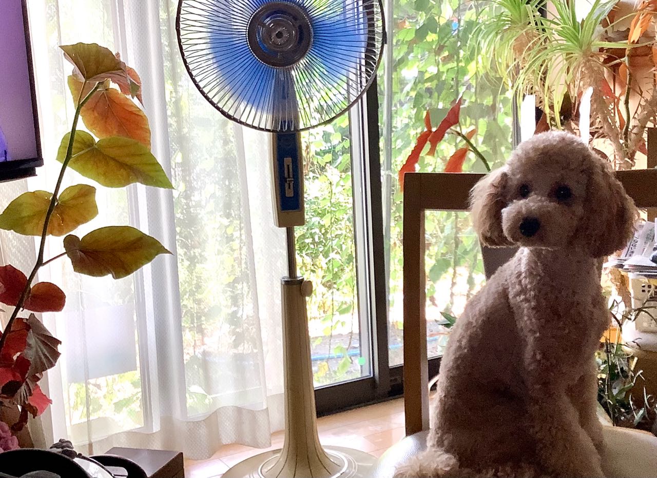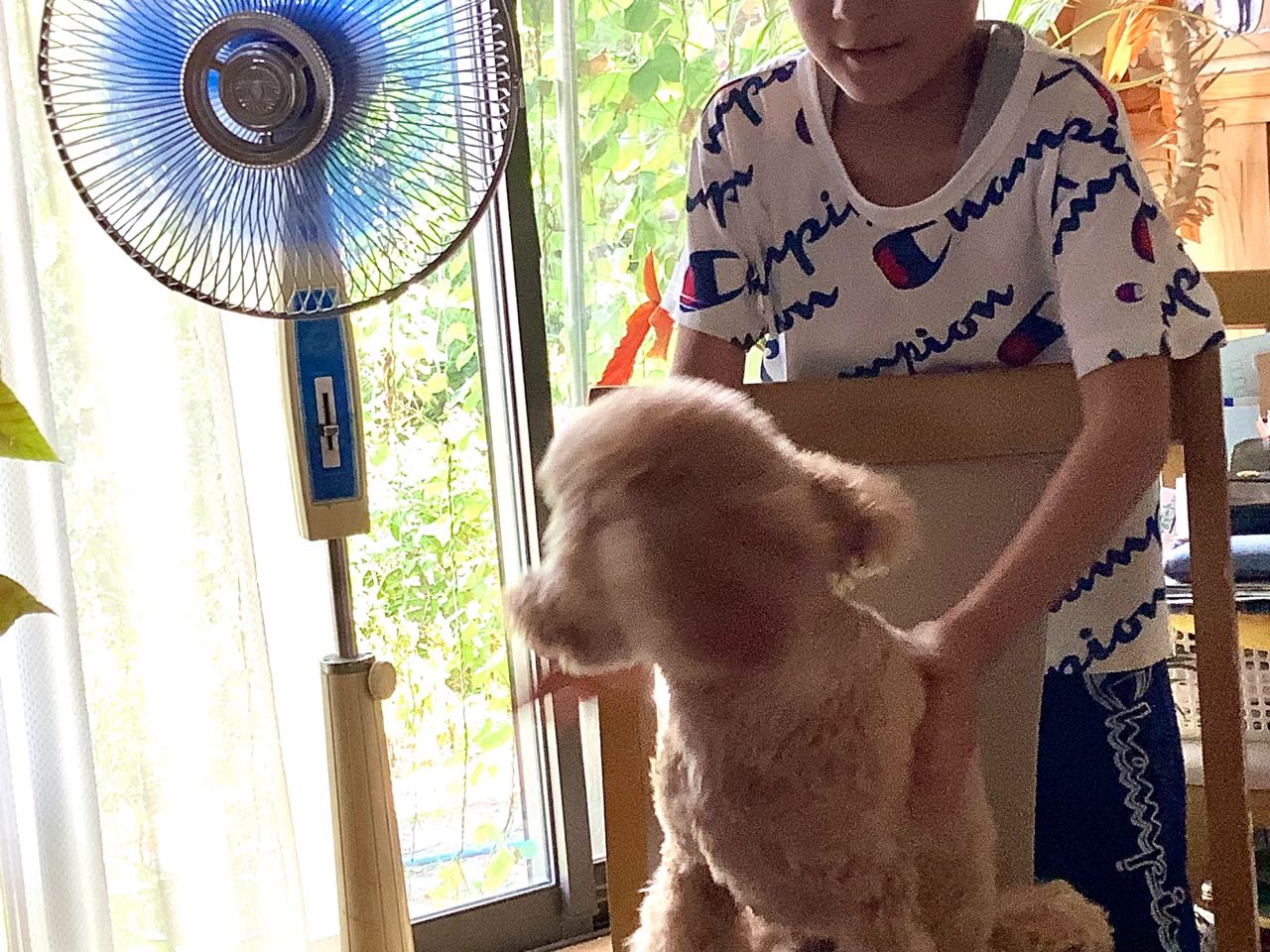 ワンちゃんも、キッチンの椅子に乗り、クーラーの、効く部屋で、扇風機を回しながら、とっても気持ち、.良さそうに.過ごしています、ご覧になって下さい、