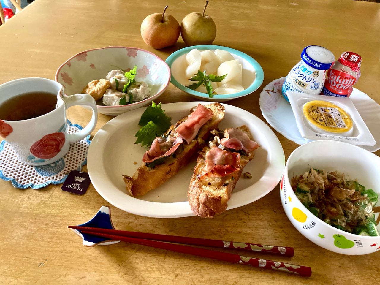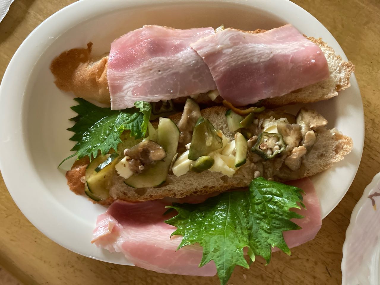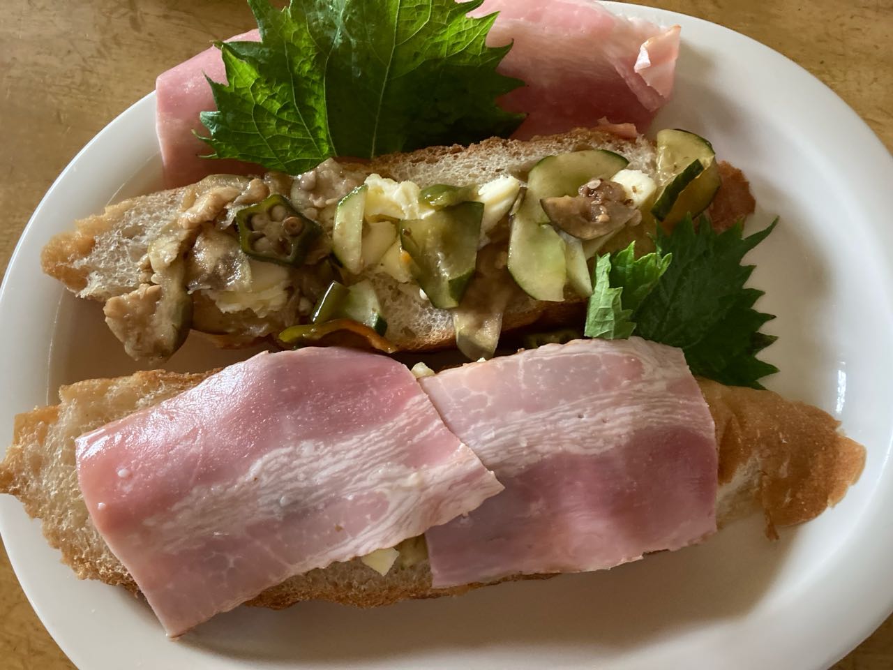 28日.孫が→数日前に☆大きなフランスパンを、買ってきましたけど、全然.手付かずで、食べないため→捨てるのが.もったいないから、今朝.私が長く切って.「野菜やベーコン」を.載せて.オーブンで☆焼いて☆→いただきました、