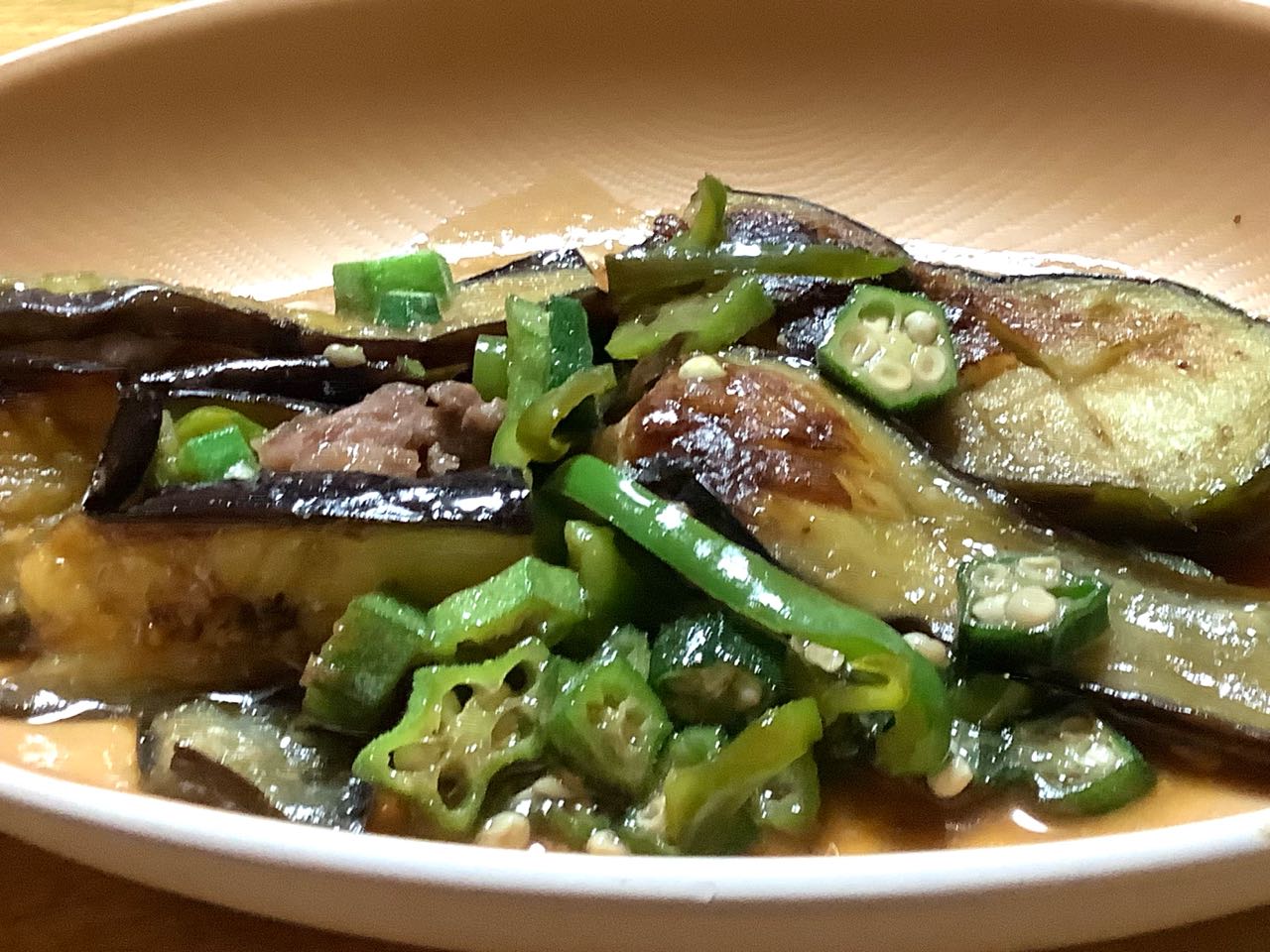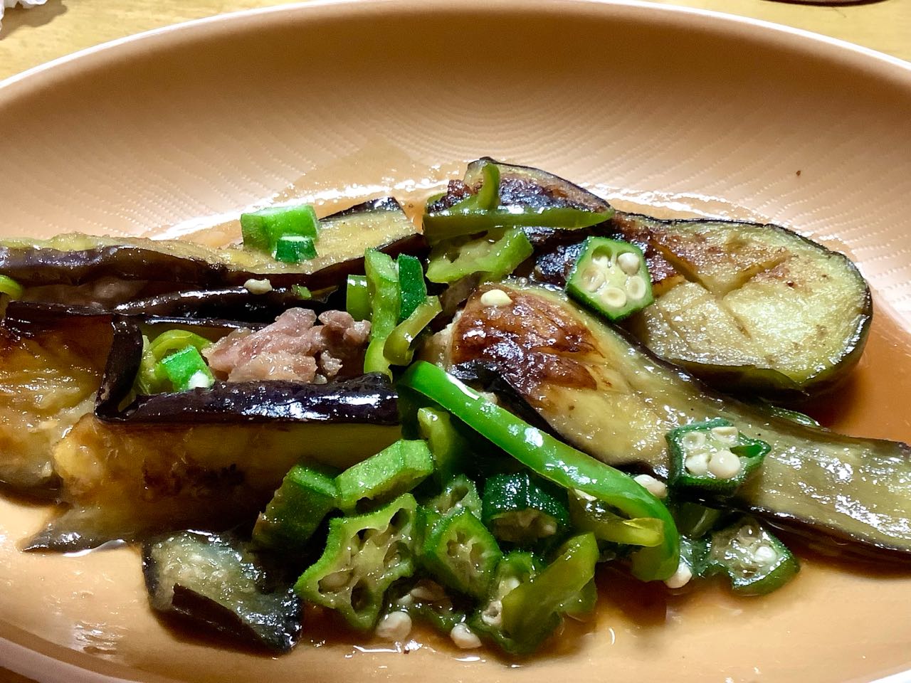 一邦さんが、これは→美味しい.おいしいと言って、沢山作ったはず.の、お料理が、あっと、いう間に、これだけに.なって~しまいました。→茄子と.お肉と.ピーマンと.オクラの、お料理です。、
