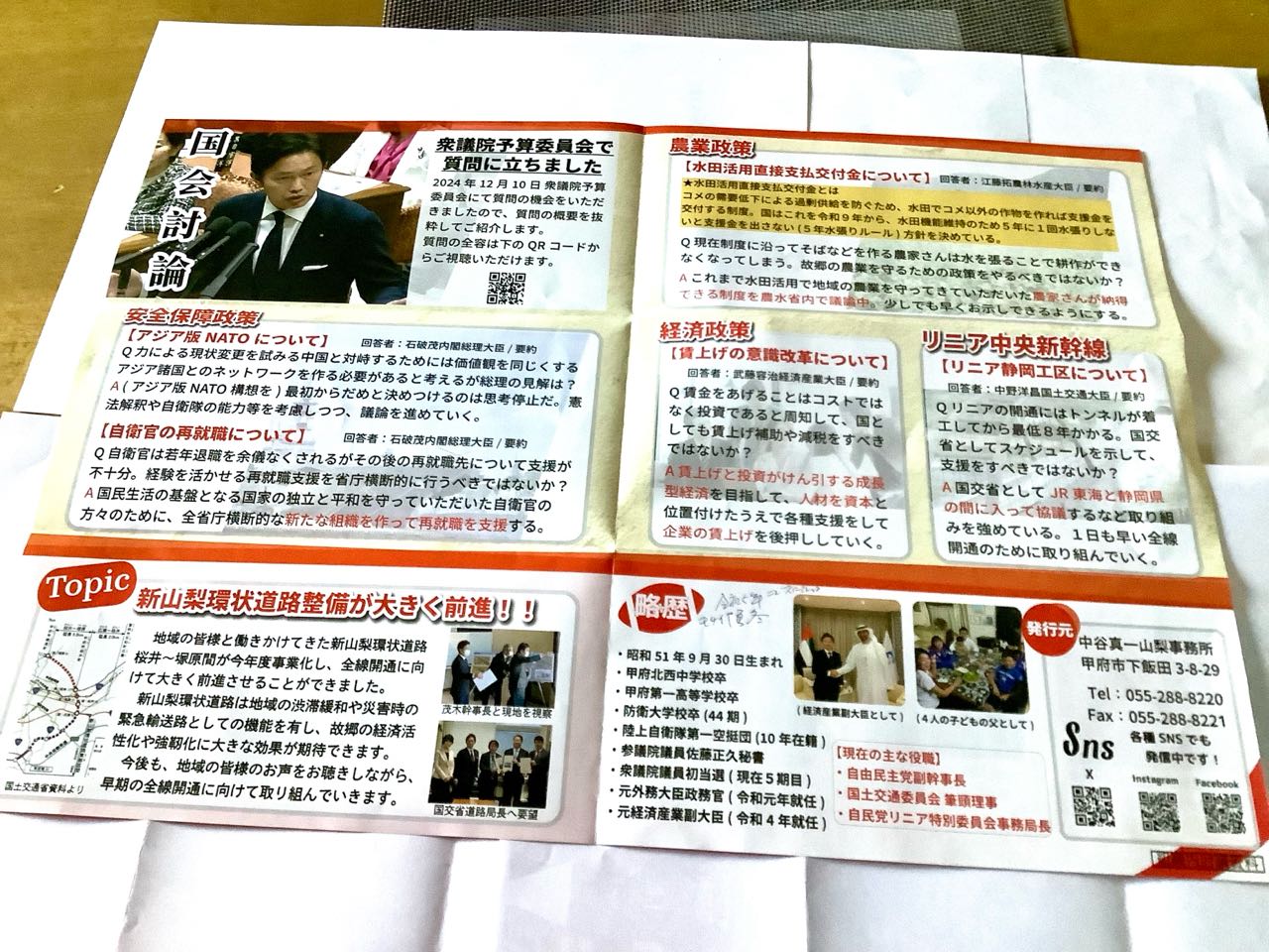 11日.午前11時30分より→山梨県自民党本部.事務所に於いて☆衆議院議員、中谷真一先生の♪女性部「みつばちの会」が開催しました。会場いっぱいに、大勢の女性が集まり、活発な意見が交わされました。その様子と、中谷先生の、昨年度の.国会での.国政報告を→お話しされました。.会場では→令和7年度♪新春号☆☆.国政レポートを.拝見しました、→→ご覧になってください.