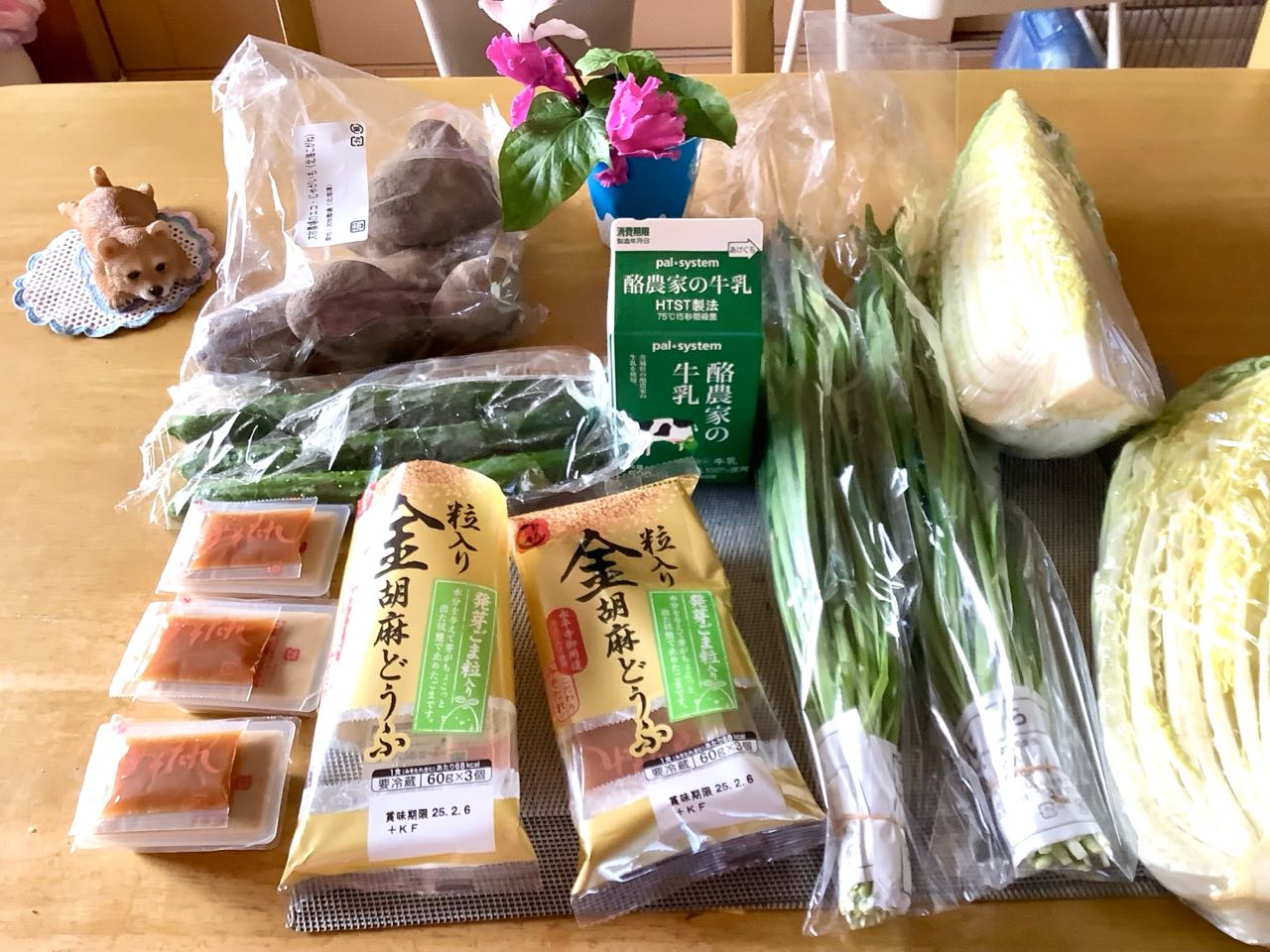 20日.パル、システムから、野菜→1)白菜、2)ニラ、3)きゅうり、4)じゃがいも、5)[酪農農家」の牛乳、6)「永平寺の胡麻豆腐」を、取り寄せました。