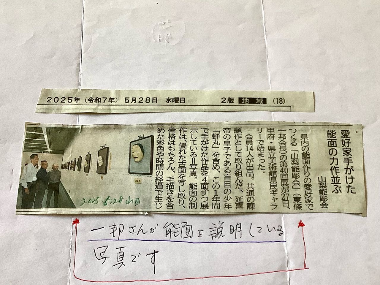 6月1日まで、山梨県立美術館、ギャラリーB室に、於いて、山梨能面の.展示会を開催しております。、今朝の山日新聞に.一邦さんが、能面の説明をしているところが、写真に載りました、、ご覧になってください、