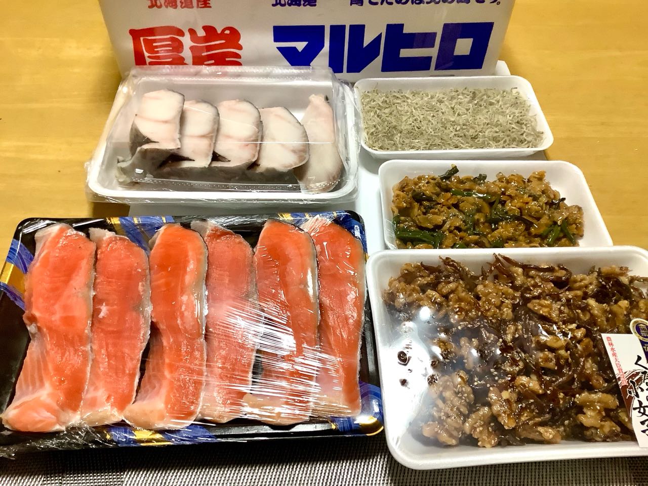 28日.山梨能彫展の→帰りに.甲斐市で→お魚屋さんを.している、お友達から..たくさんの.お魚を.いただきました。厚切りの→1)紅鮭、2)銀ダラ、3)しらす、今晩の、ビールのおつまみに、4)くるみの小女子を→いただこうと思っています、私の大好きな♪♪5)「貝の佃煮」も入っていました。