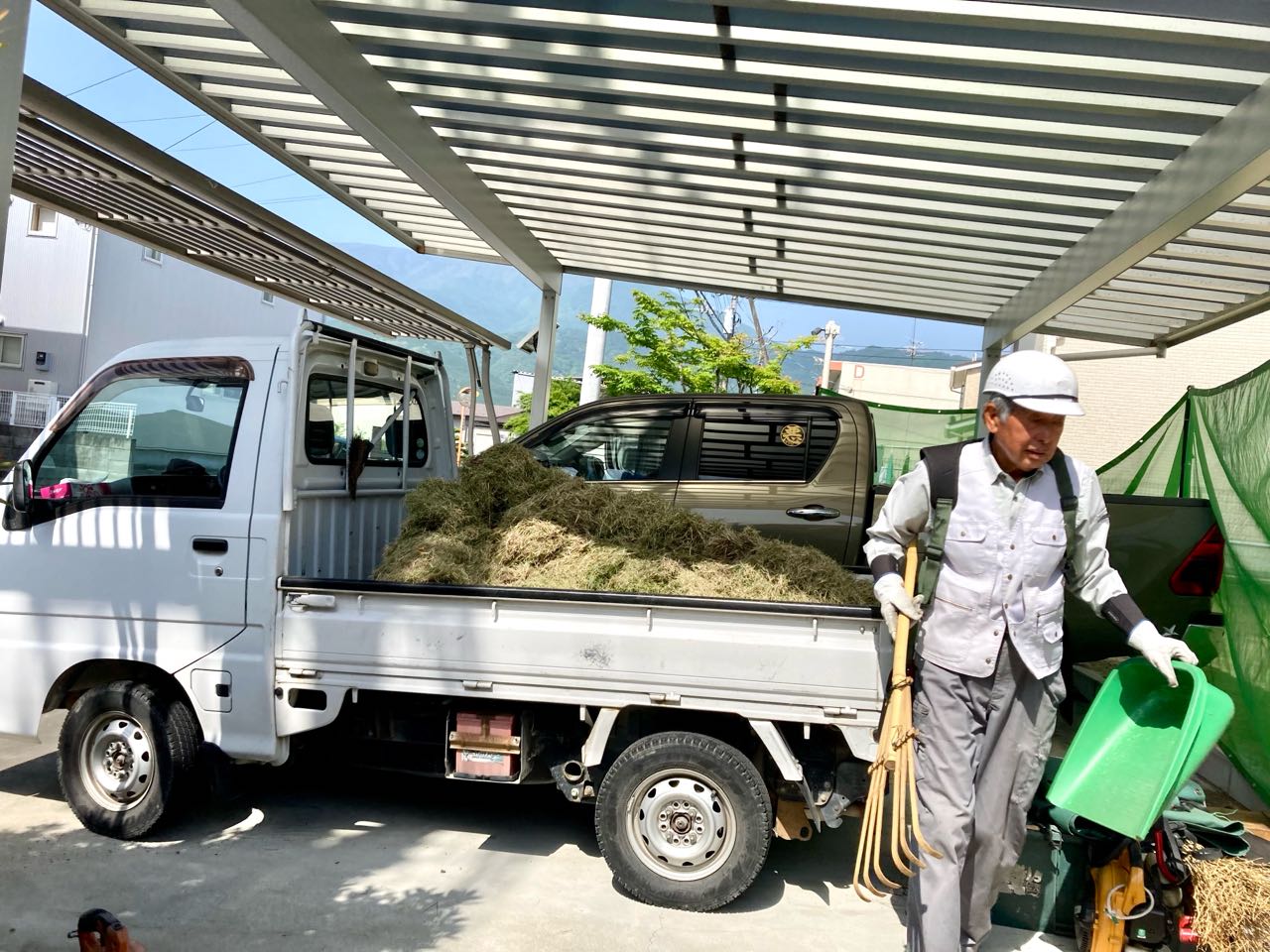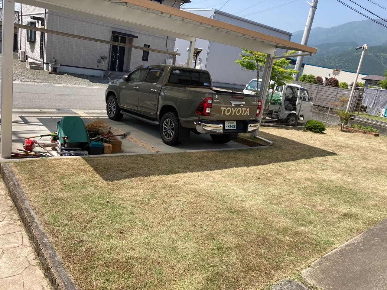 20日.南アルプス市飯野..息子の家に.シルバー人材センターから、3人来てくれて、芝を、きれいに、刈ってくれました.機械で芝を買ってくれたから、とっても、きれいになりました、刈つた→芝が.軽トラック荷台に.いっぱいになり、1人のおじさんが、芝を、積んで捨てに.行きました。、1人1000円づつ、お駄賃を.差し上げました、とっても.喜んでいました。ご覧になって下さい。