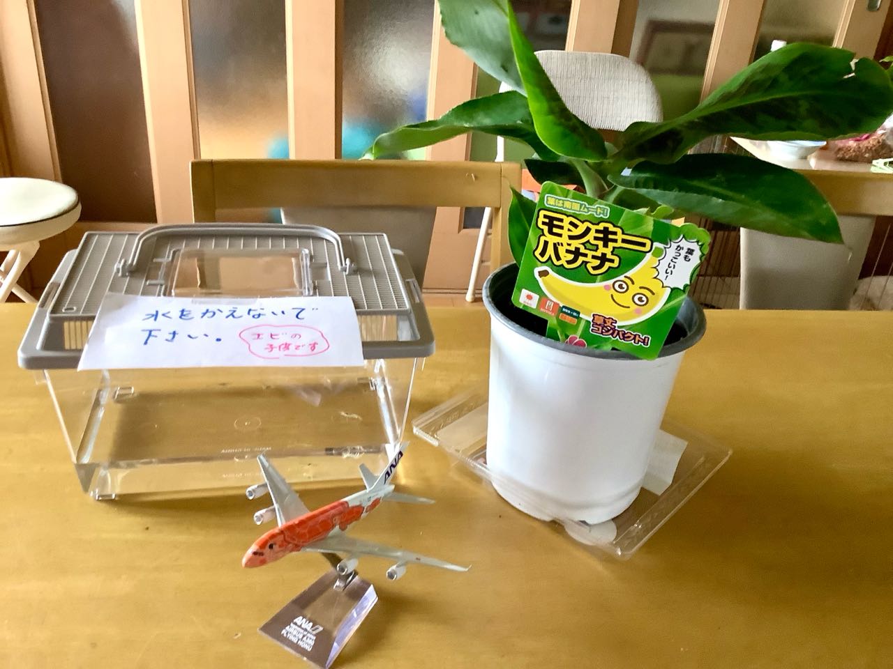 21日.テーブルの上に→「モンキーバナナの木」と...小さな.「小エビの子供」が、水槽の中を、スイスイと、泳いでいます、