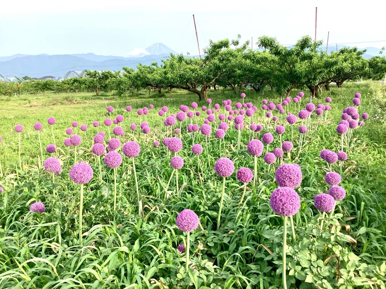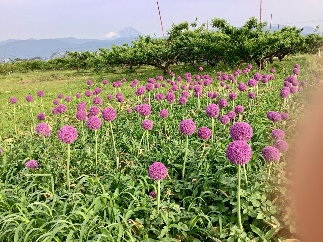 南アルプス市.西野地区の畑に→毎年この時期になると、紫の.丸い大きな花が.一面に☆☆咲き誇っています、今年も.昨日→さつき会から帰りに.道路端に.きれいな紫の花が咲いて.いましたので、写真を撮りました。遠くには.富士山も見えます。きれいな花を→ご覧になってください。、