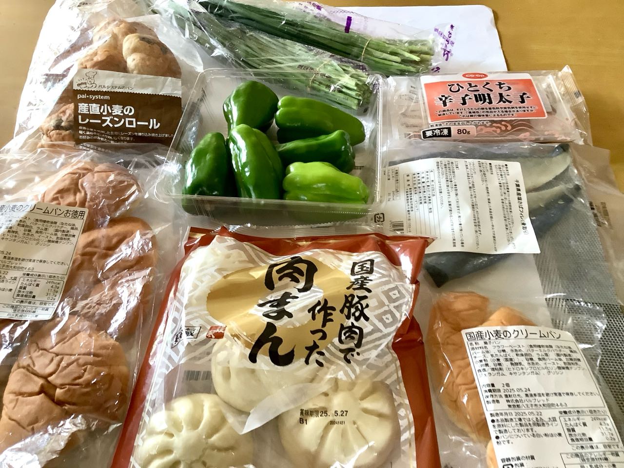 レーズンパン、クリームパン.肉まん.ニラ2束.ピーマン. 1口辛し.明太子、骨抜き→サバ、.デラウェアと乳酸菌ドリンクです.