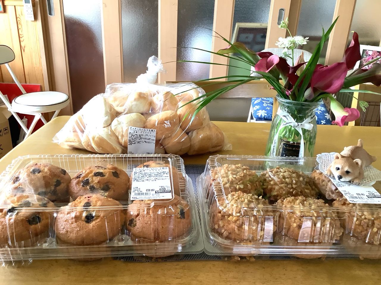 バナナ、ナッツ、マフィン6個入りと、大きなお寿司や、海老等も、買ってきてくれました、お寿司は→昨日の.夕飯にいただきましたが、大きな.たくさんの.パンをご覧になってください.