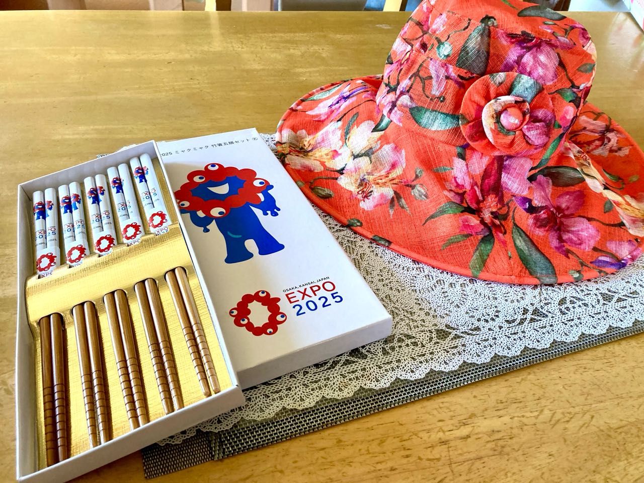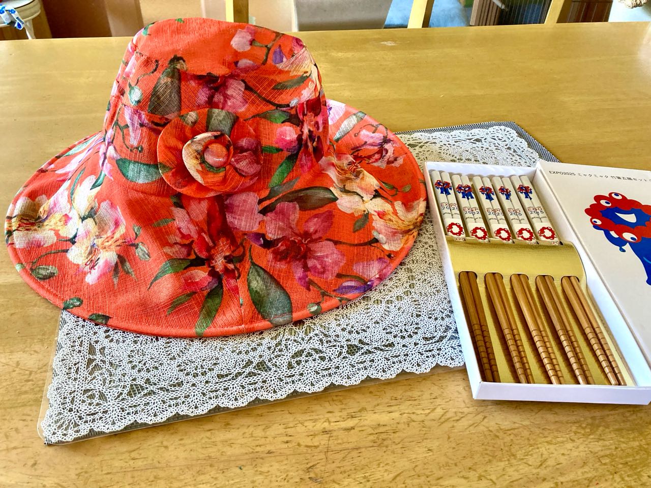 20日→21日と、孫家族が、大阪万博へ行って来た、お土産を→小学校.2年生の孫(男児)から→赤い.綺麗な.ステキな☆花柄の→お帽子と、万博の箸を、沢山頂きました、