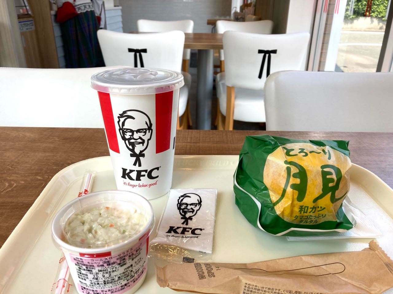 1日.こま共立病院→整形外科受診の、帰りに..お昼は、ケンタッキーの、今、テレビで☆☆宣伝している、月見バーガーと、コールスローサラダと、アイスコーヒー、Mサイズを、いただいています。とっても→美味しいです。ご覧に→なってください。