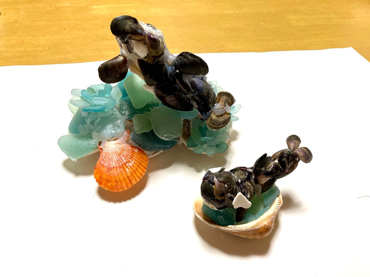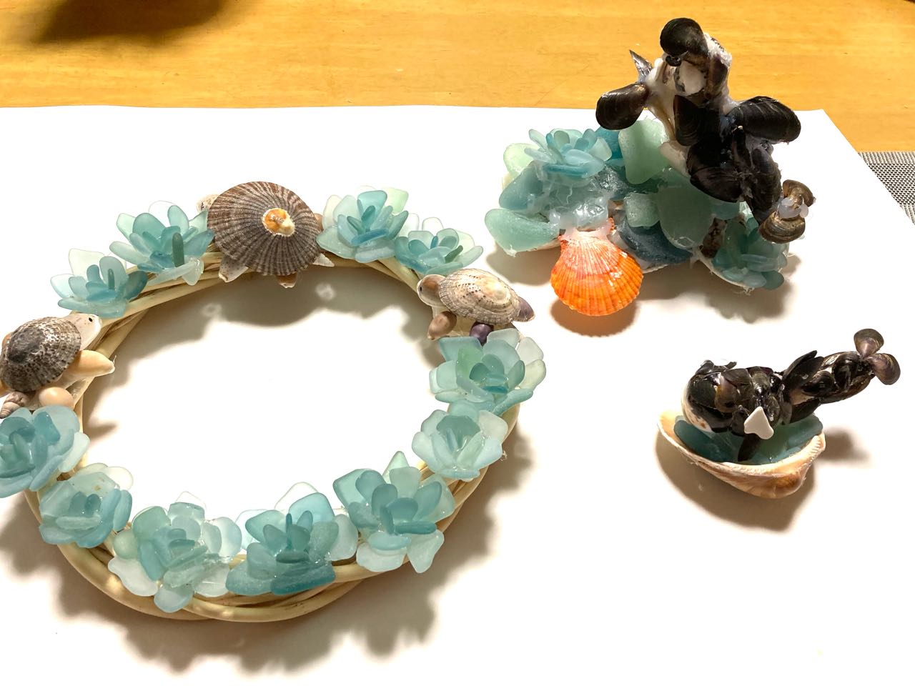 Akiko(次女)さん→家族が.→房総半島へ出かけた.お土産を→いただきました、鴨川.シーワールドで、シャチの、飛び上がった時の様子を、想像しながら、貝と→海岸に押し寄せて来た.ガラスを利用して、作ったそうです、大きなシャチは→小学校2年生、小さいシャチは→小学校5年生の作品です、ママの作品→☆亜紀子さんは、ガラスで→玄関へ.飾るリースを.作ったそうです。