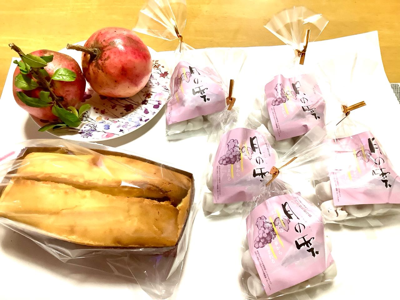 昨日、夕方、敷島町にお住まいの、栄養管理士の小渕先生から、サツマイモの、「パウンドケーキ」と、私の大好きな→月の雫と、大きな.ザクロを.2個いただきました、先日.ビックな→サツマイモを.差し上げたら、こんなに.大きな.パウンドケーキを作って、届けてくれました、