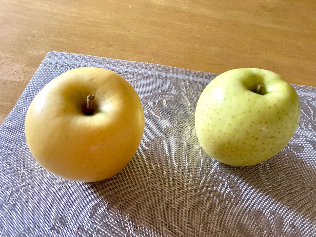りんごを食べたくて→昨日.南アルプス市内の.スーパーに行って、「王林と赤いりんご」を買ってきました。今朝、送られて来た→青森県から→届いた「りんご」の箱の上に、昨日→買って来た、「リンご」を、載せて写真に撮りました