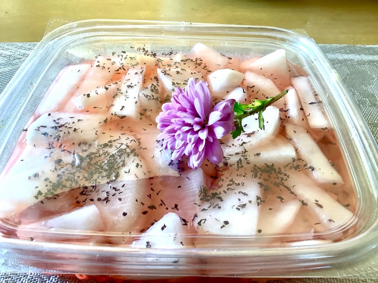 我が家の畑でとれた大きな太い大根を今朝家族さんが.1本抜いてきましたので、早速→甘酢漬けにしてみました、