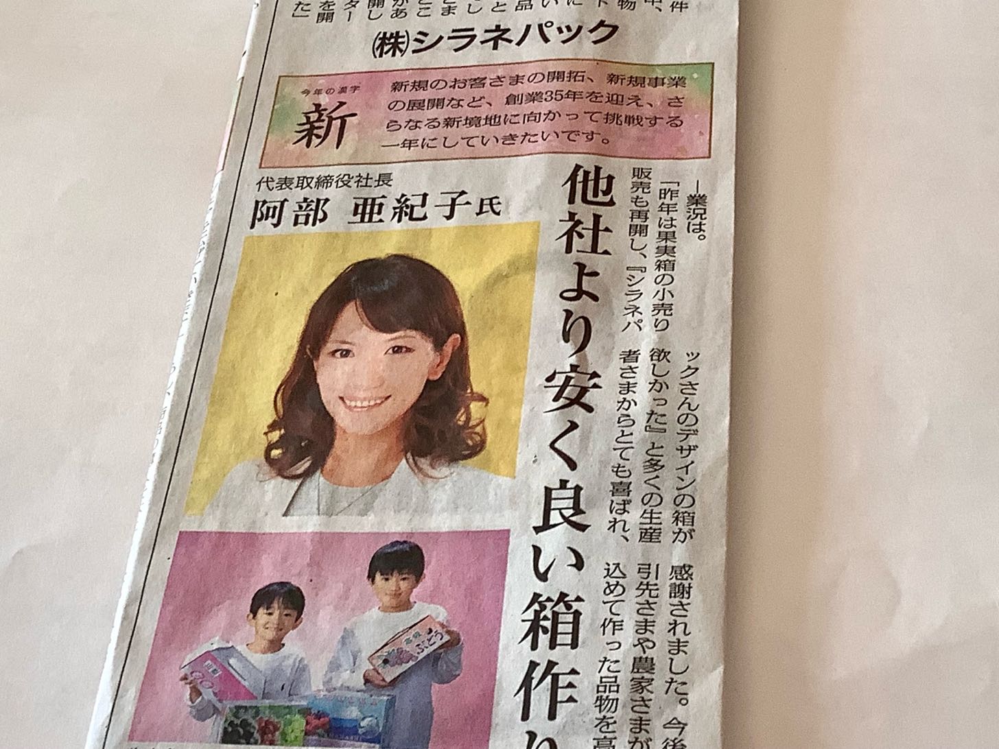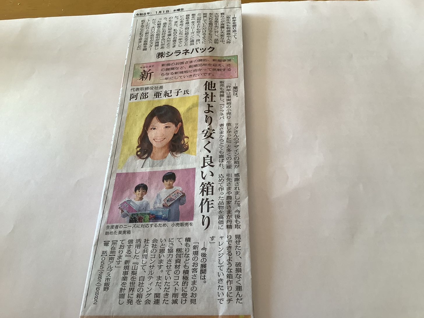 2026年元旦、1月1日の山梨日日新聞、トップインタビューの(87)面に、株式会社、シラネパック社長、阿部亜紀子さんの、新年の抱負が、→載りましたのでご覧になってください。孫たち2人も.→箱を持って、載っていますので、